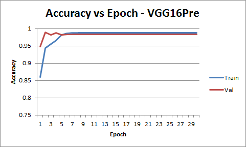 Finally I experimented with the pre-trained weights for VGG16. These weights were calculated by training the VGG16 model on the ImageNet dataset. That dataset is composed of hundreds of thousands of examples with 1,000 classes. The classes cover a range of things including objects and animals. These are seemingly unrelated to digits, but generalizing a model trained for one problem to another (or transfer learning) has been shown to be very effective [3]. In order to do the transfer learning, I tried two approaches. The first approach I used was to initialize the layer values in VGG16 with the weights from ImageNet, but to retrain all of them with the new dataset. The other approach I used was to freeze the first 6 layers of VGG16, meaning that those weights would not be changed during training. I choose the first 6 layers because the Analytics Vidhya article mentions that earlier layers capture more general features like overall shape.