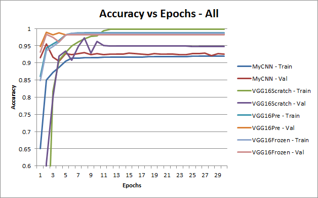 From the learning curves it can be seen that training accuracy increase sharply as the number of epochs increases in the beginning for all models. It then plateaus at 5 to 11 epochs based on the model. The VGG16 trained from scratch takes the longest to reach a steady state, which makes sense since it has no prior information to help it train. My CNN also lacks prior information, but it is simplistic enough to quickly train all the layers. There does not appear to be much overfitting in any of the models as validation accuracy does not decline as training accuracy increases. Interestingly the two pre-trained VGG16 models have relatively high validation accuracy in the early epochs, showing the value of the transfer learning.
